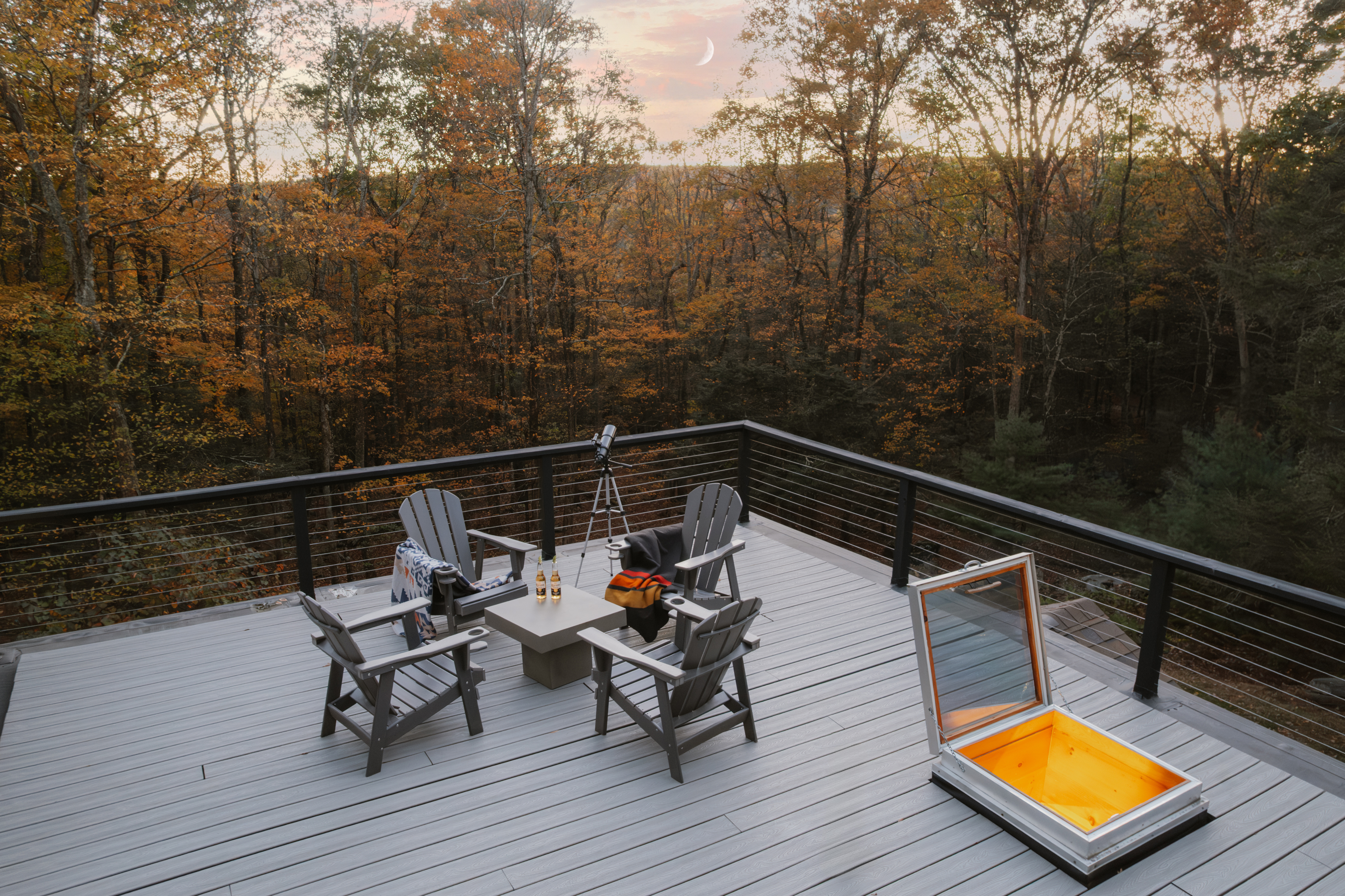 Tuthill Treehouse – Your private Catskills hideaway on 9 forested acres Picture yourself soaking in a cedar tub beneath a canopy of trees, then climbing to a roof-deck to count constellations through a telescope while piano music wafts through windows down below. Welcome to your modern-rustic retreat carefully designed for quiet luxury, deep breaths, and unforgettable memories.